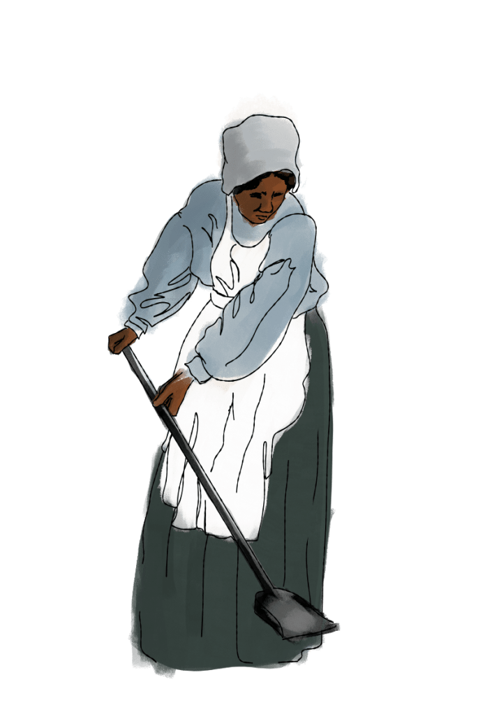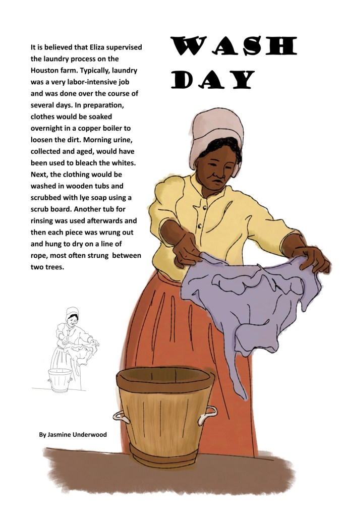 Eliza Revel (abt. 1825 – 1898) was an enslaved laborer who managed most of the Houston family’s household affairs. She cooked, cleaned, healed, and fed General Sam Houston’s wife, children, and grandchildren. Eliza is illustrated here performing one of her many tasks in the kitchen.