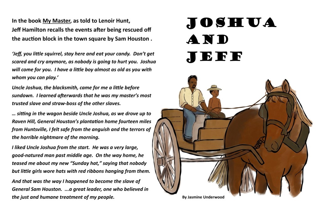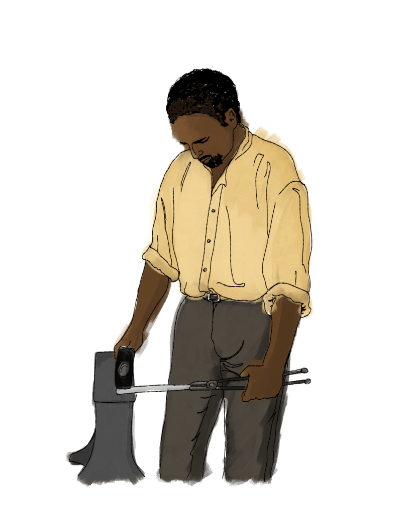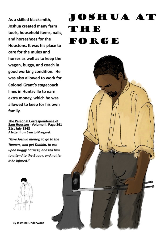 Pictured above is Joshua Houston (1822-1902). He is illustrated performing one of the many talents he was skilled in. Joshua Houston’s skill was so well known, that he was often hired out as a blacksmith to make money of his own.